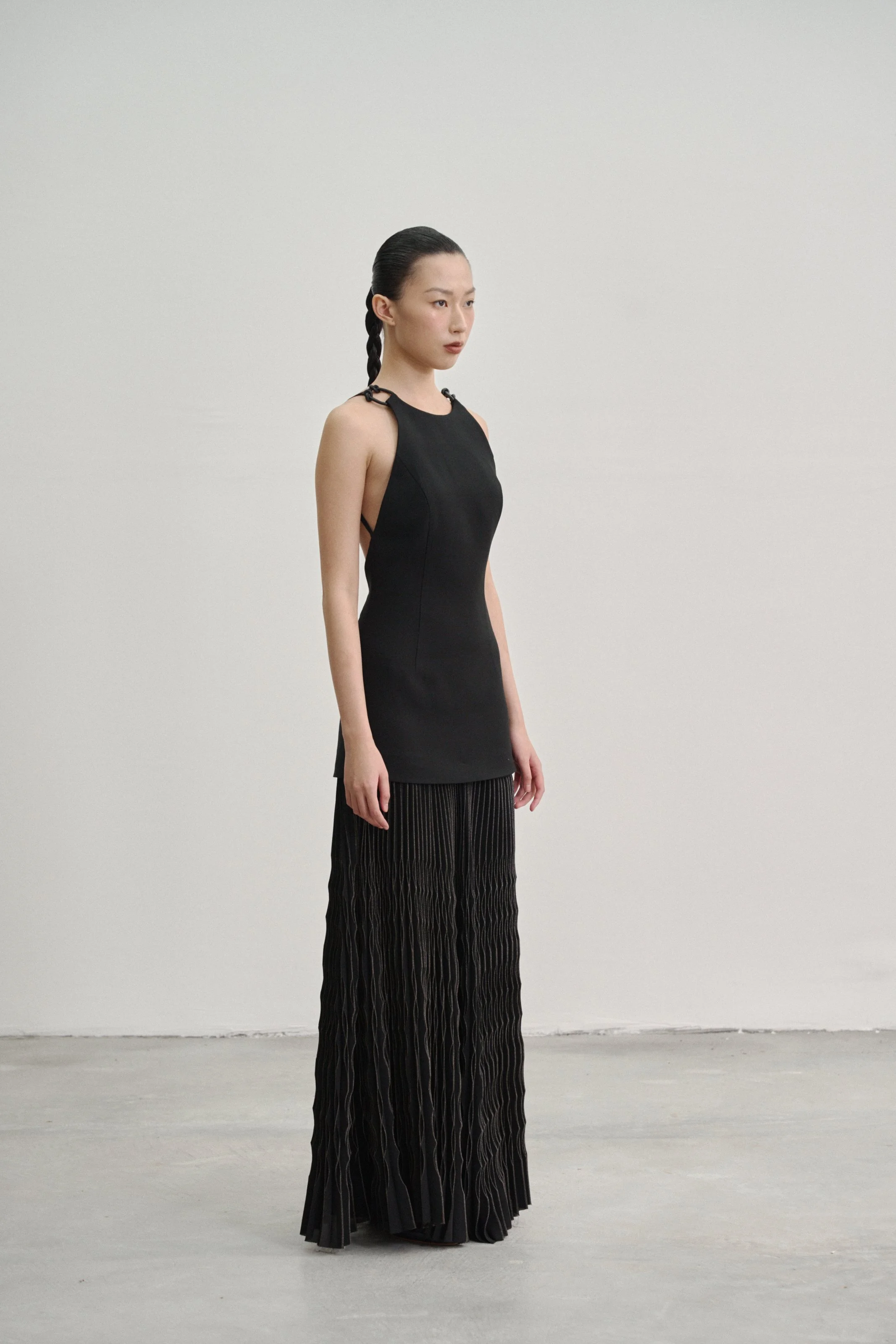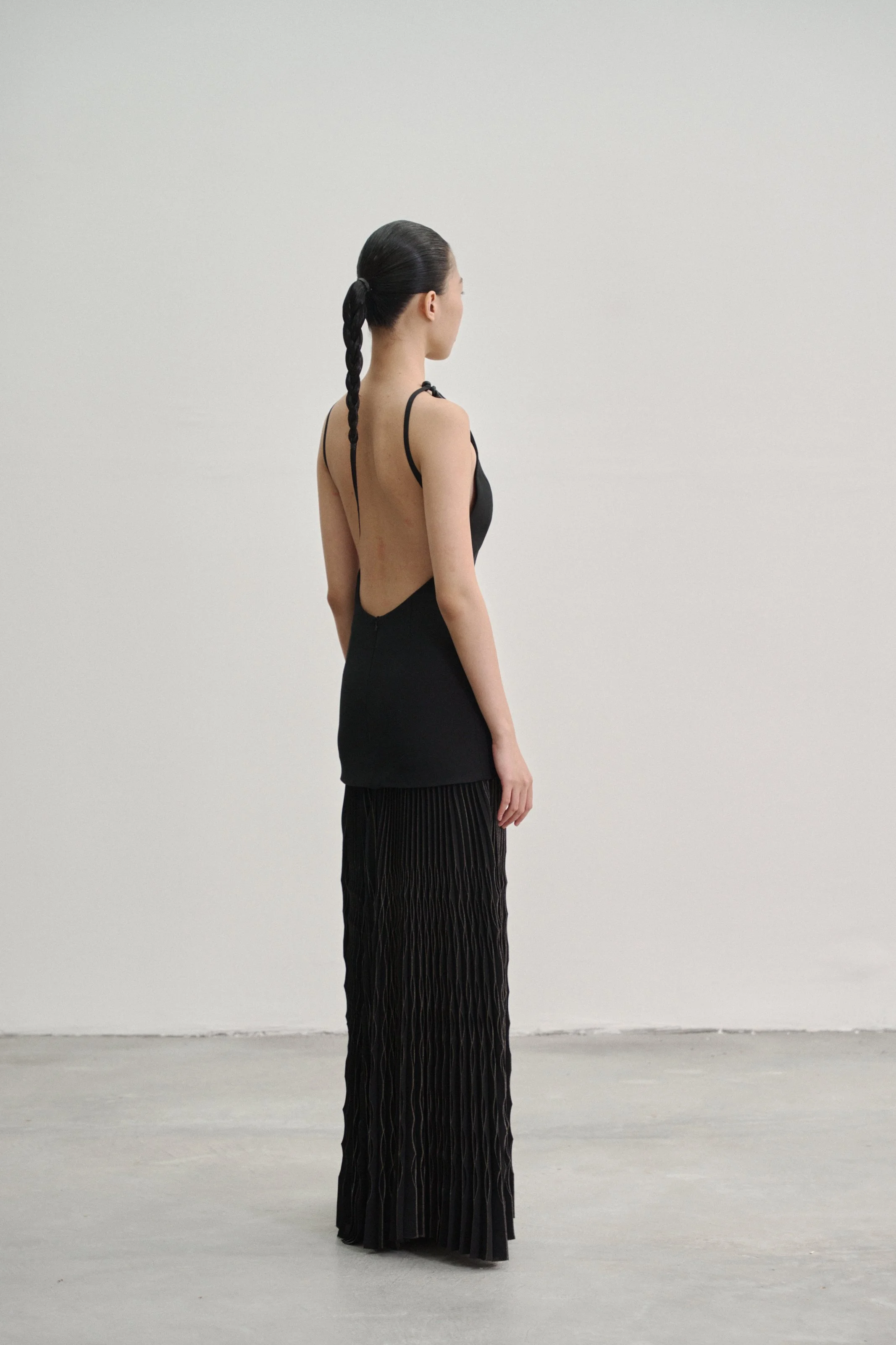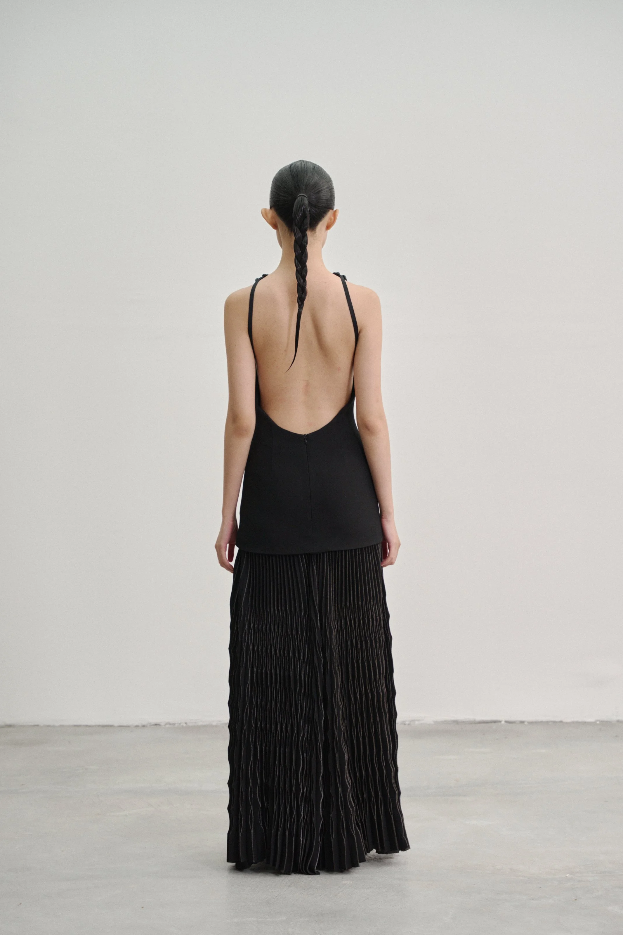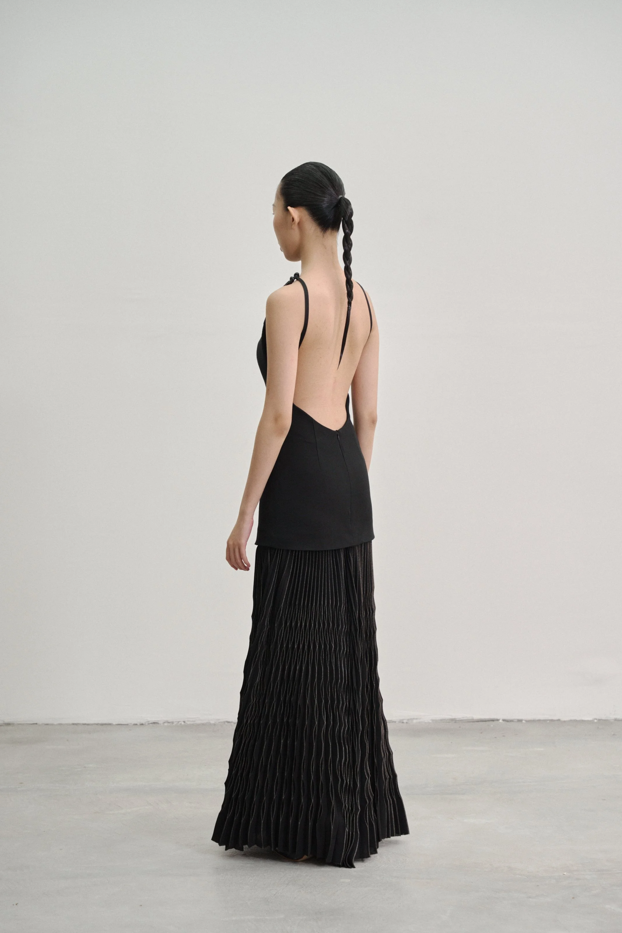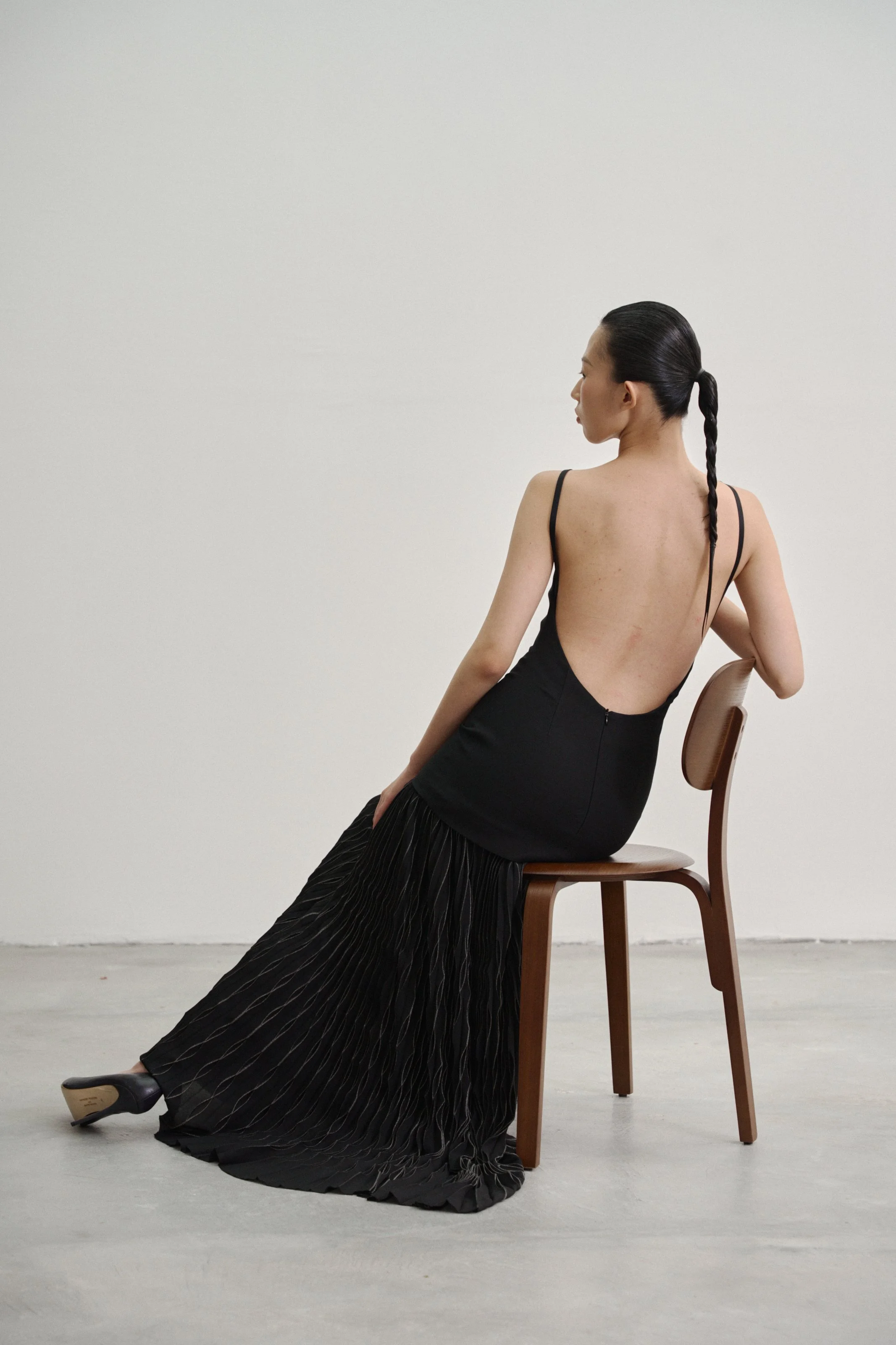 Details: Our “Kupu Loop” dress is crafted in a wool–silk blend with a fitted, backless silhouette, anchored by two elastic straps that fasten to leather-bound shoulder loops by Talee Studios. The skirt extends into four panels of silver-coated sunray pleats, while an invisible back zipper ensures a clean, seamless closure.
