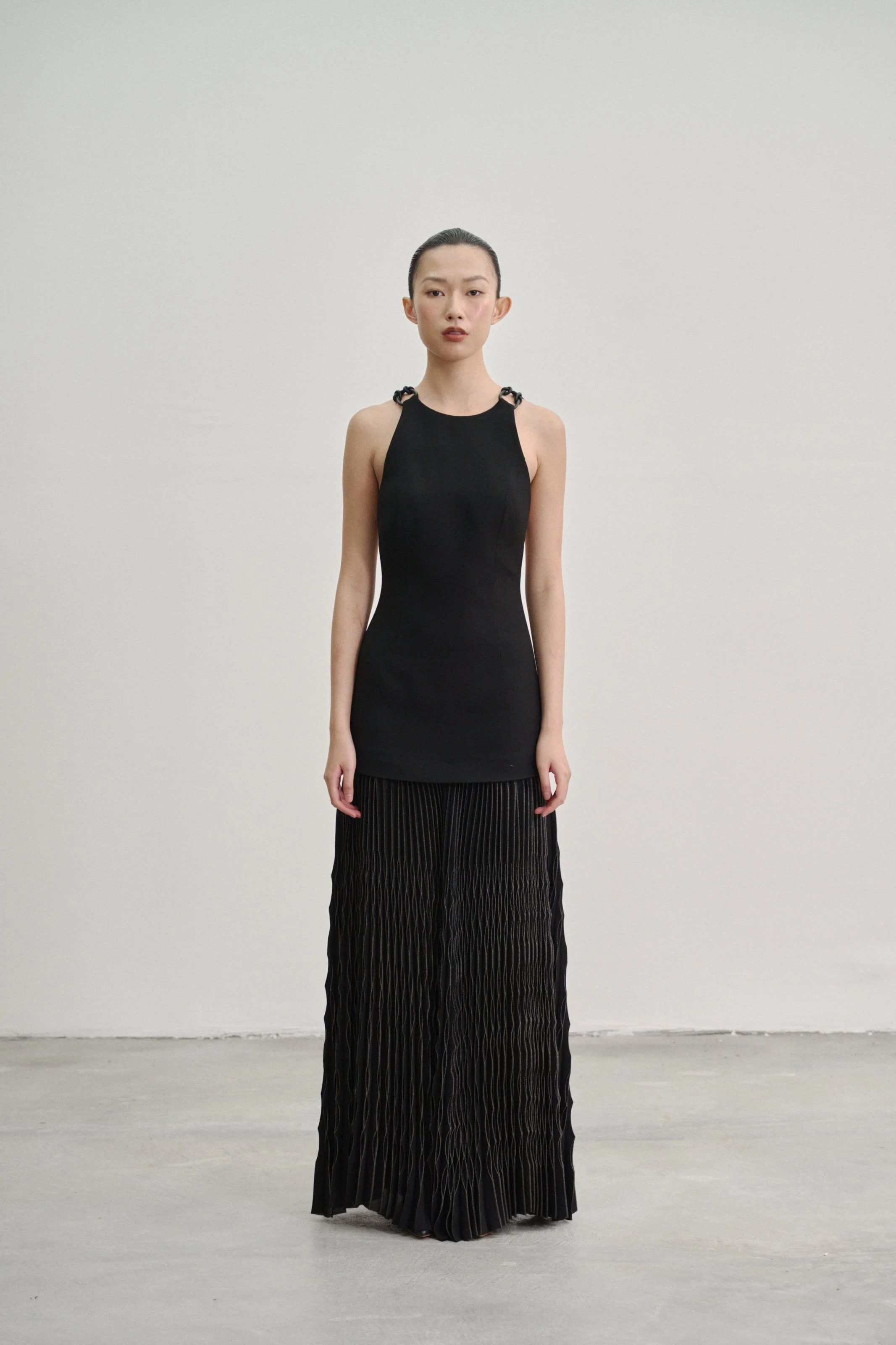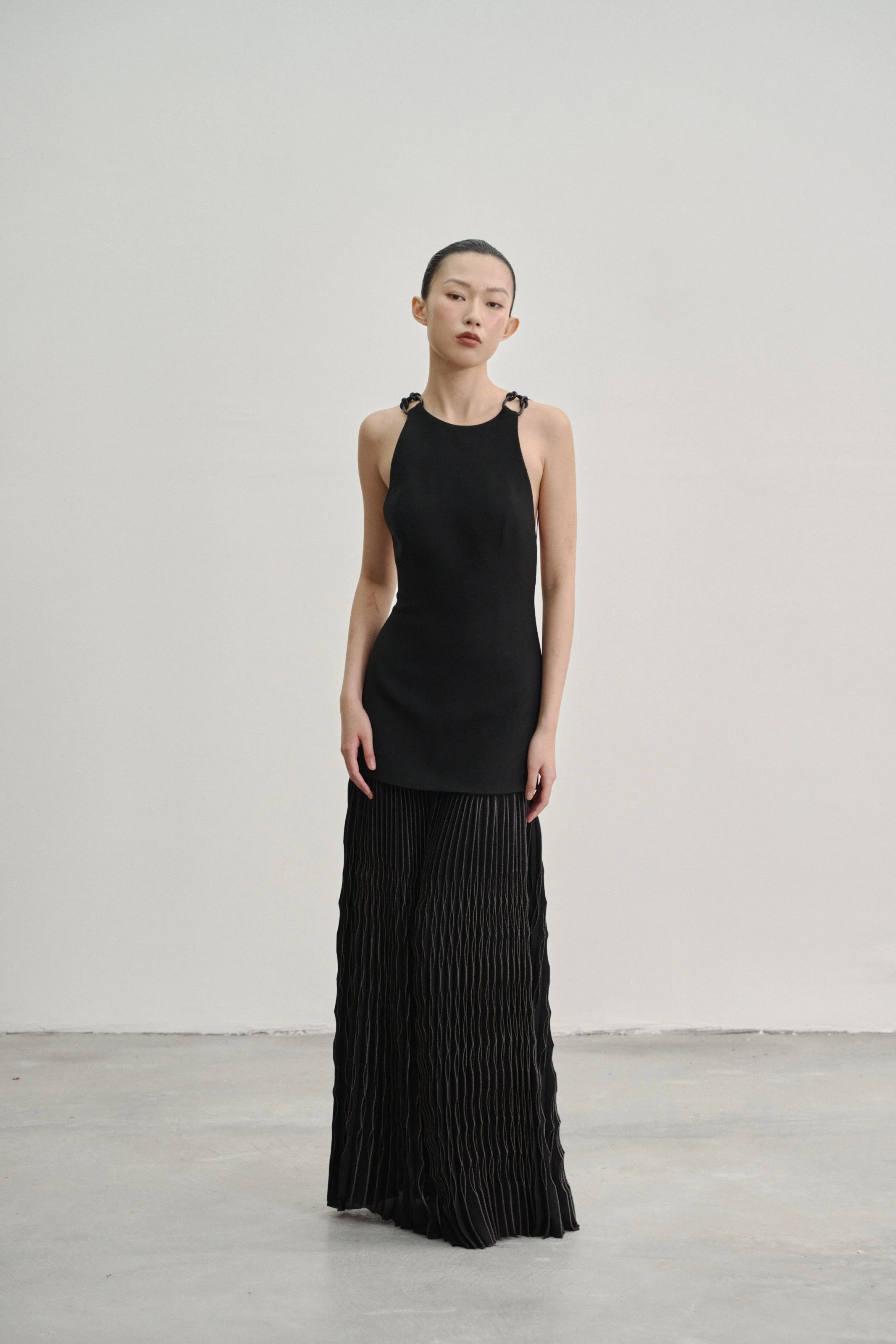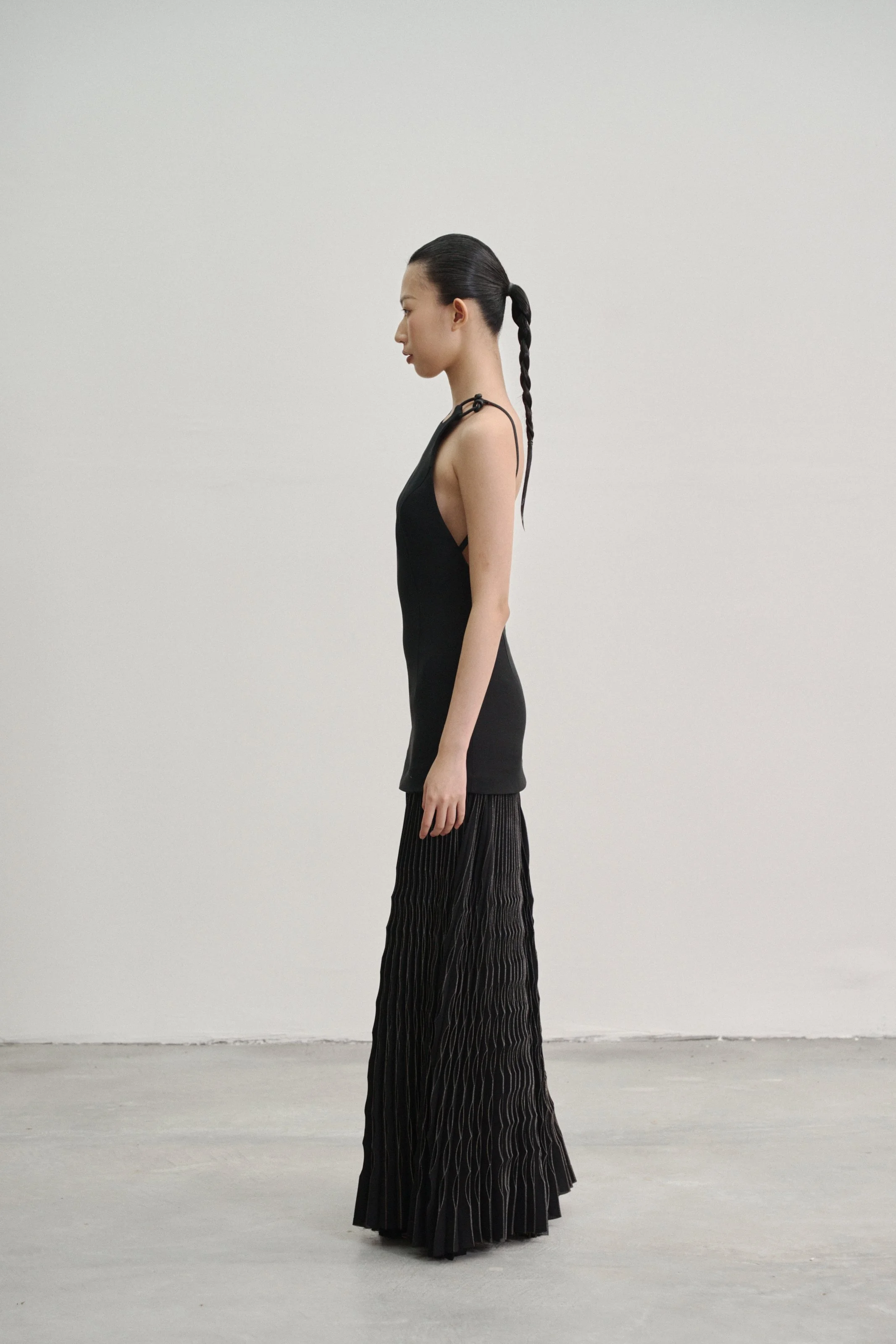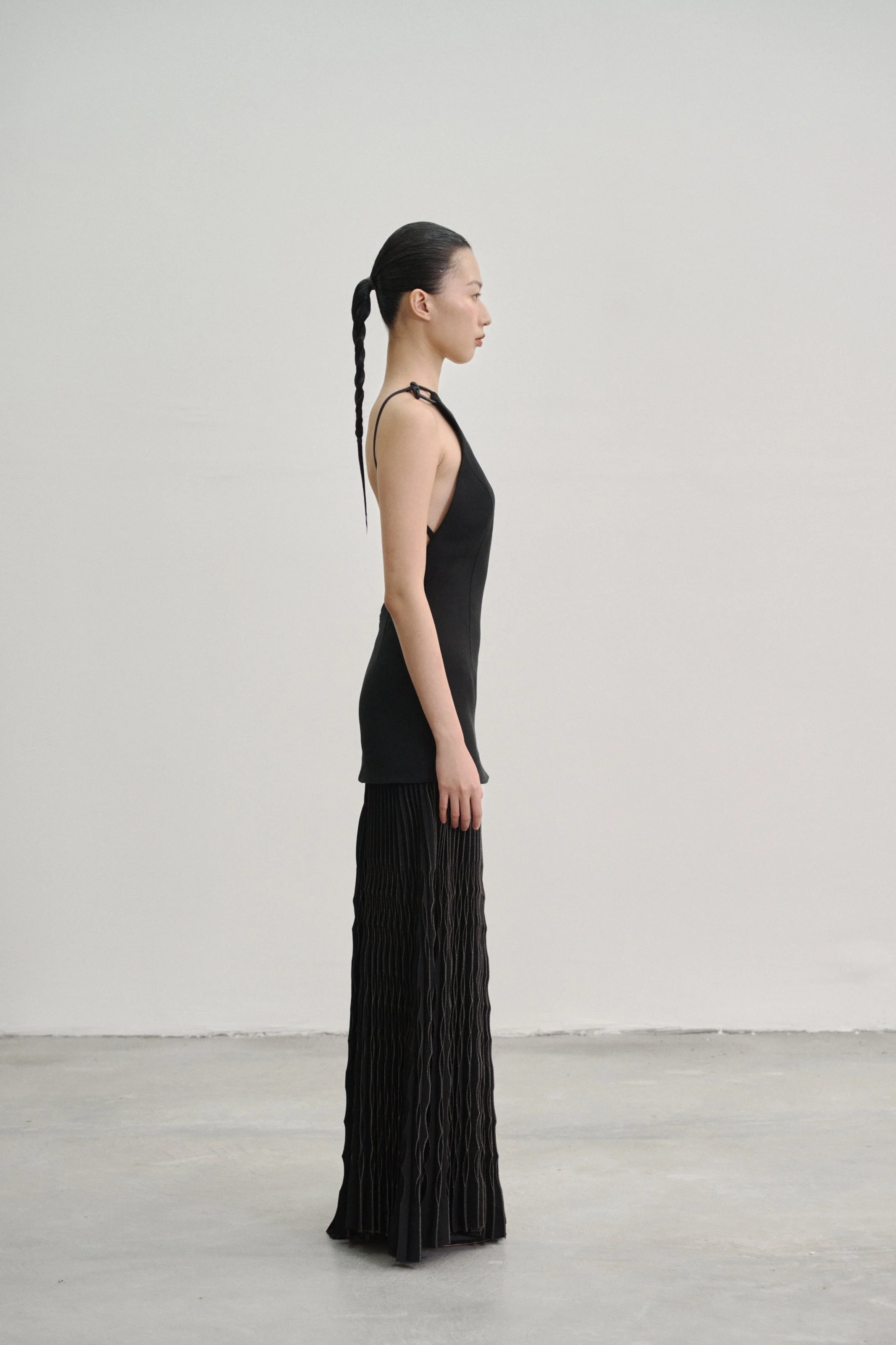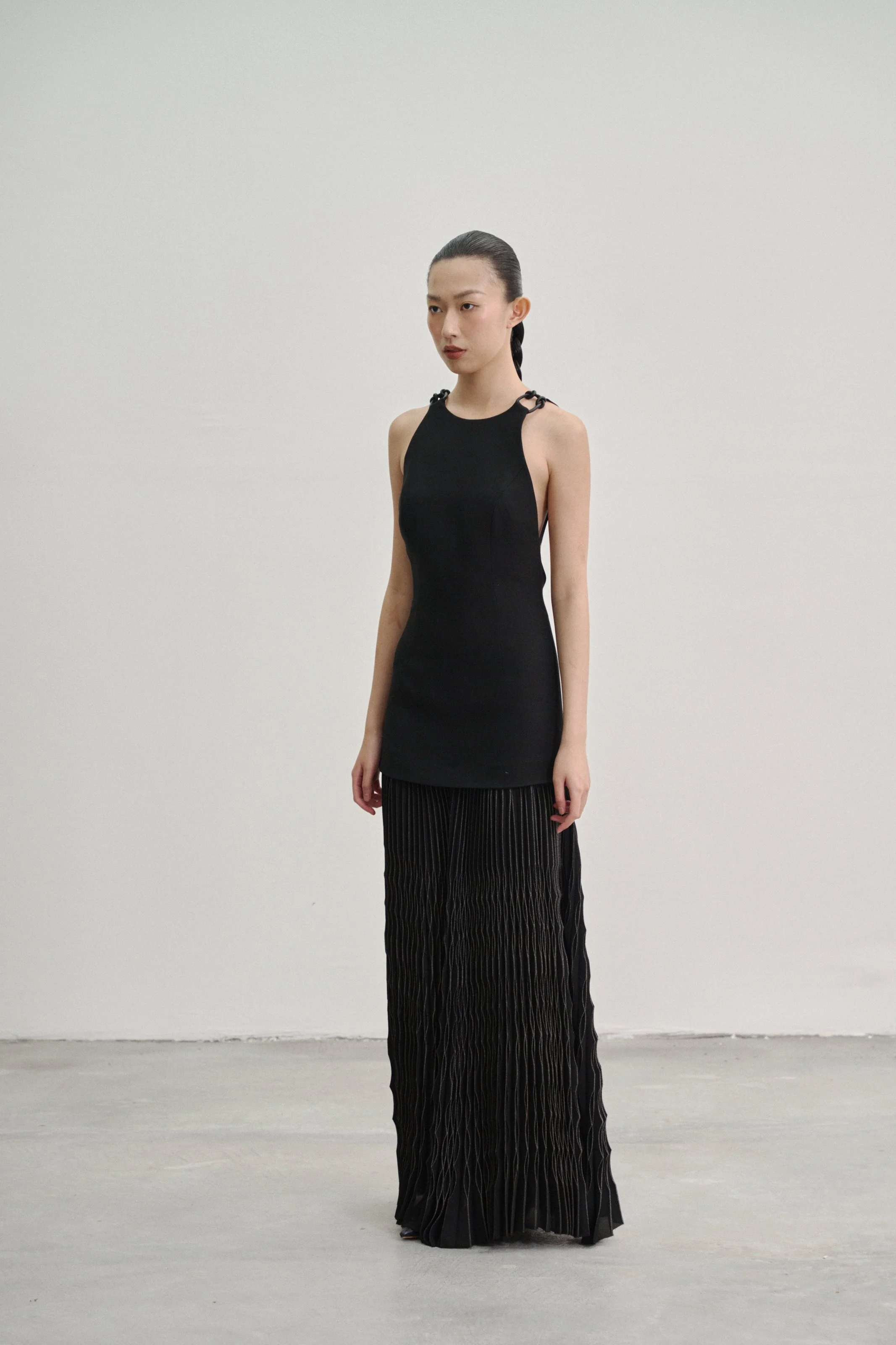Details: Our “Kupu Loop” dress is crafted in a wool–silk blend with a fitted, backless silhouette, anchored by two elastic straps that fasten to leather-bound shoulder loops by Talee Studios. The skirt extends into four panels of silver-coated sunray pleats, while an invisible back zipper ensures a clean, seamless closure.